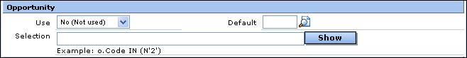 Type a partial SQL statement as shown in the example below this field to allow selecting and linking only an account matching this SQL statement to a document of this type. To check the results of this filter, click Show next to this field. This field is ignored if Use of the Account section is No (Not used).