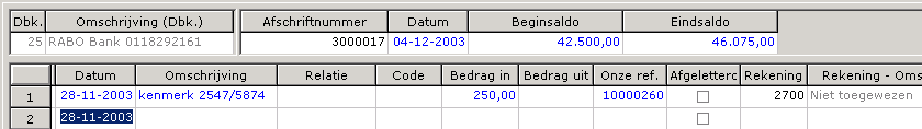 Nadat u de regel heeft doorgetabt en alleen de omschrijving en het ontvangen bedrag heeft ingegeven, wordt automatisch een onze referentie gegenereerd uit uw nummertraject. Tevens wordt de rekening 2700 Niet toegewezen gekoppeld. Deze rekening is gedefinieerd bij het onderhouden van het betaalmiddel. Dit is uw kruispostenrekening voor deze bankrekening. De volgende boeking wordt dus gemaakt: