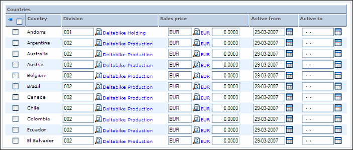 This column displays all the active countries available in the system which you can copy the item to. Select the check box in the first column to copy the item to the selected country. You can select more than one country at the same time. To select all the active countries, select the check box on the first column header. For more information on activating a country, see Modifying Country Data.