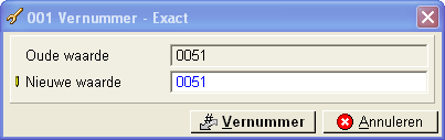 In bovenstaand scherm kunt u het nieuwe nummer opgeven. Dit mag ook een bestaand nummer zijn. Indien u een bestaand nummer ingeeft worden de grootboekrekeningen samengevoegd. Zodra u kiest voor 'Vernummer' zal het oude nummer worden gewijzigd in het nieuwe nummer.
