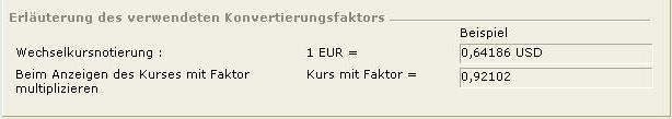 In diesem Bereich wird erklärt, wie der Konvertierungsfaktor angewendet wird, um die Standardwährung EUR in eine Fremdwährung zu konvertieren.
