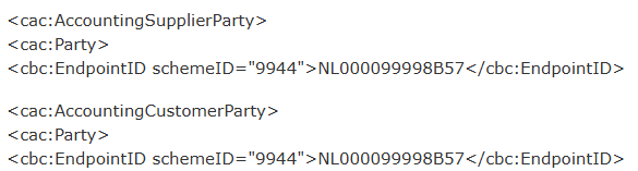 Het SchemeID voor het Nederlandse btw-nummer is “9944”. Je kunt het SchemeID opvragen bij https://docs.peppol.eu/poacc/billing/3.0/codelist/eas/.