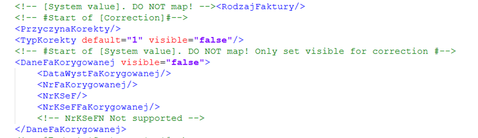 Tags like DaneFajorygowane should be set to visible=”true” without mapping if you get the instruction “do not map the tag DaneFakorygowane”. Proper maintenance and mapping of the tags will ensure valid KSeF invoice generation.
