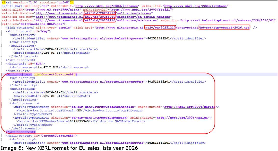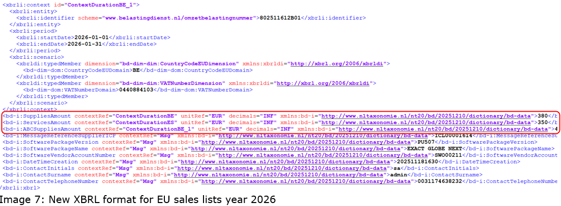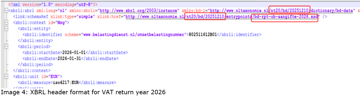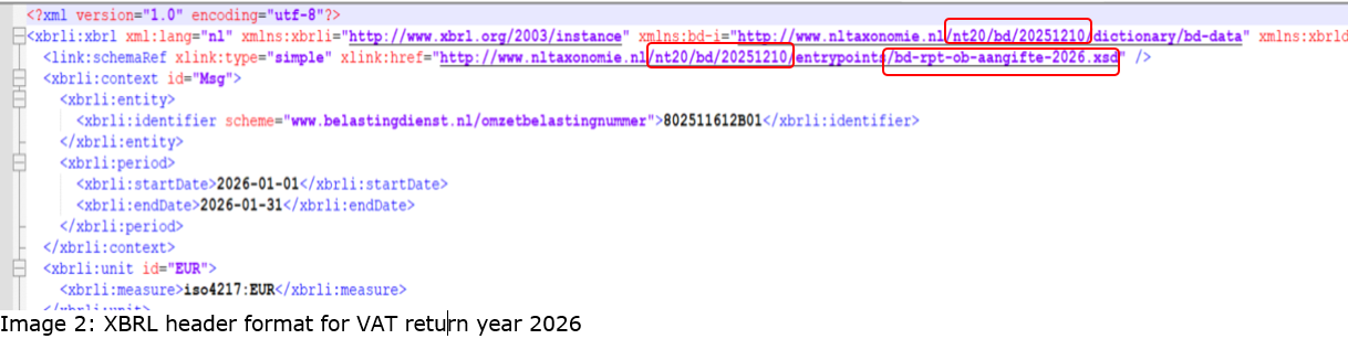 Starting in 2026, the VAT return, VAT correction, and EU sales list will use the updated 2026 taxonomy when submitted to Digipoort. Previously, XBRL files were generated during the final print of the reports.