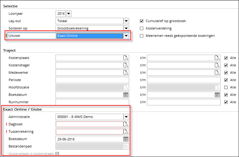 veld 'Uitvoer'. Als de optie 'Exact Online' is geselecteerd wordt de sectie
