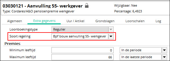 'Extra gegevens' worden de APG Bouwpremies aangegeven. Voor componenten aangemaakt met de componentenwizard wordt dit automatisch juist gevuld. Voor zelf aangemaakte componenten dient u dit zelf aan te passen. U kunt de juiste 'Soort regeling' selecteren wanneer u op het tabblad 'Extra gegevens' eerst de correcte sector (03, 06, 58, 59, 60) selecteert.
