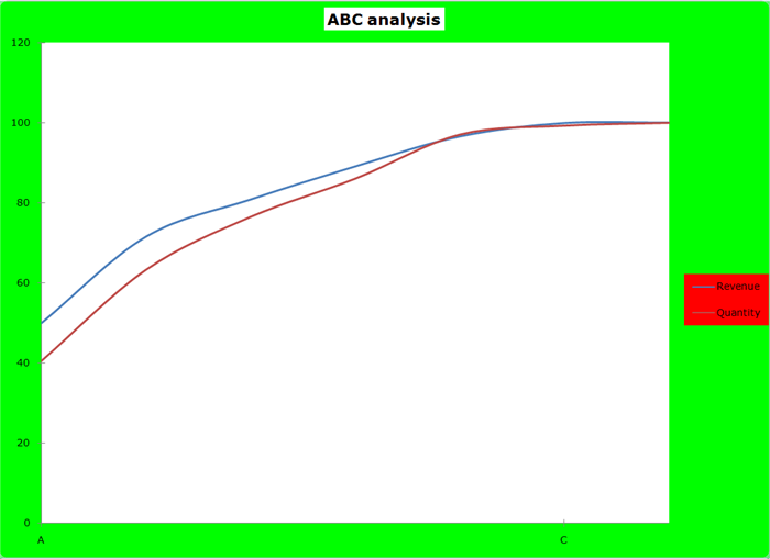 Note: The A box refers to the group of items that have the highest revenue or items with the highest sales while the B and the C box are items that make up the rest of the total revenue or quantities sold. The total percentage of A + B + C must be 100%.