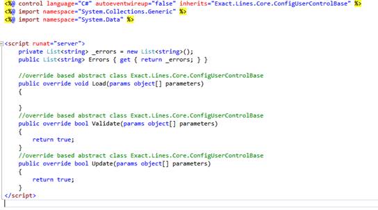 Note: You can refer to the Exact.Lines.Workflow.ExpenseClaim.dll\ ECUIConfigProvider.cs target as a sample script.
