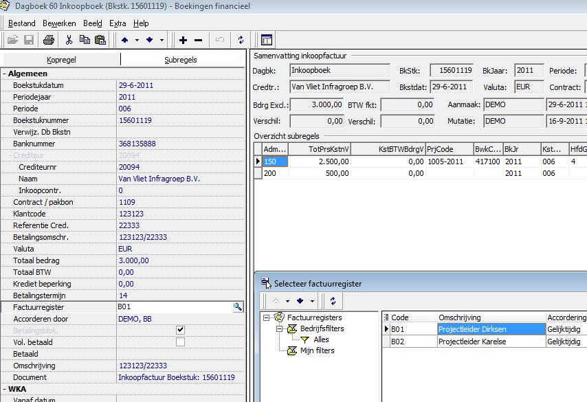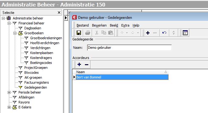 In dit voorbeeld is Demo gebruiker de gedelegeerde en mag hij facturen van accordeur Bert van Bommel accorderen.