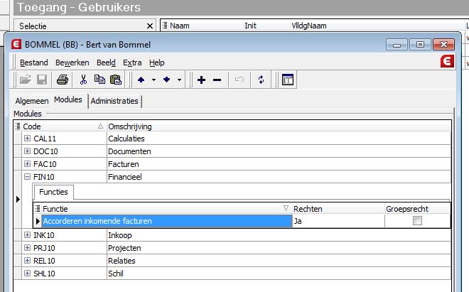 In de module Wacht Pro geeft u vervolgens per gebruiker(sgroep) aan dat deze facturen mag accorderen. Voeg hier onder modules Financieel de optie 'Accorderen inkomende facturen' toe en zet het recht op Ja.
