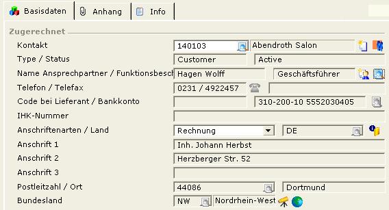 Hier werden Daten, die aus der Kontaktverwaltung stammen (inkl. Ansprechpartner und deren Anschriften), nach Auswahl eines Kontakts automatisch in die Felder dieses Bereichs übernommen. Die Verwaltung der Kontakte kann zusätzlich über diverse Icons bearbeitet, neue Kontakte können angelegt werden.