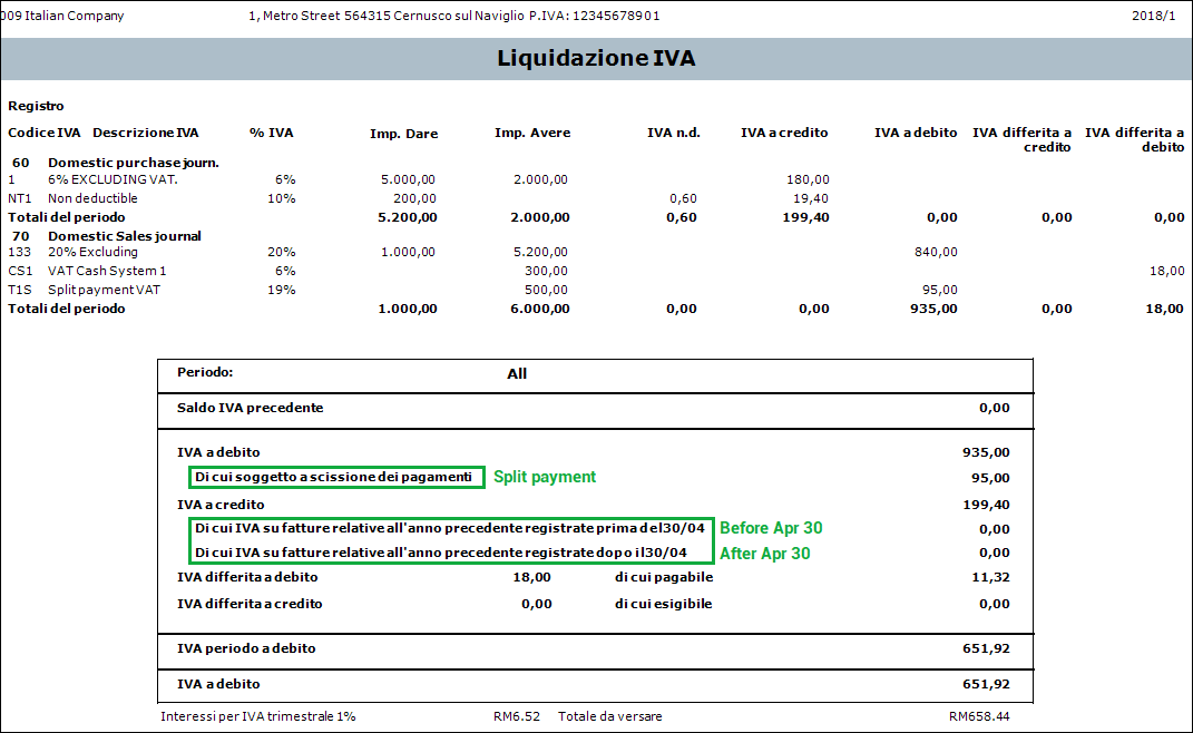 In the report, the split payments for sales invoices, as well as the sum of the purchase VAT amounts that were created last year, will not be reported at IVA periodo a credito or IVA periodo a debito for the VAT return period.
