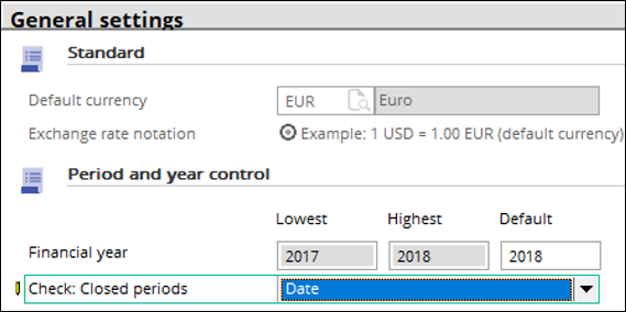 By default, the date selection will reflect the option that has been selected at the Check: Closed periods field under the Period and year control section in the general settings.