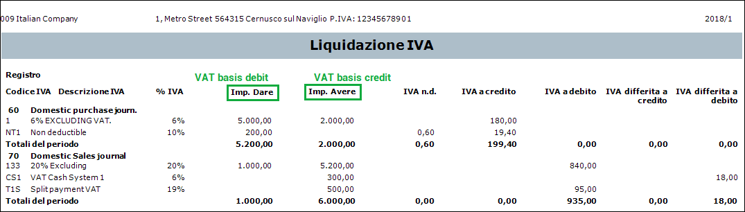 Enhancements have been made to the VAT settlement report to ensure that the debit and credit amounts of the VAT basis can be easily distinguished. Previously, the debit and credit amounts of the VAT basis were displayed in a single column, called the Imponibile column, in the report.