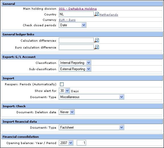 Select a year and type a period to enter the opening balance for financial consolidation and start the consolidation at the fixed period of the financial year. You can leave this blank if you do not need to enter any consolidation opening balances as in the case when you run financial consolidation from the very first period in the system. This case is probably only true for new Exact Synergy Enterprise installations.