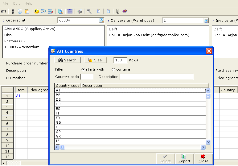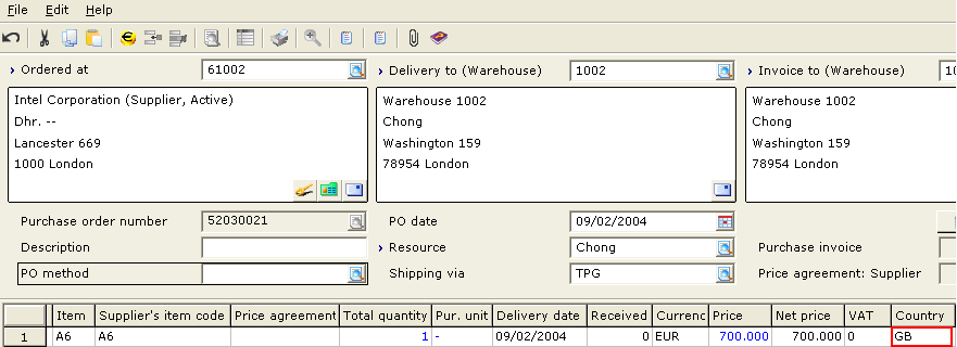 Entries > Purchase orders], create a new purchase order, there is a Country