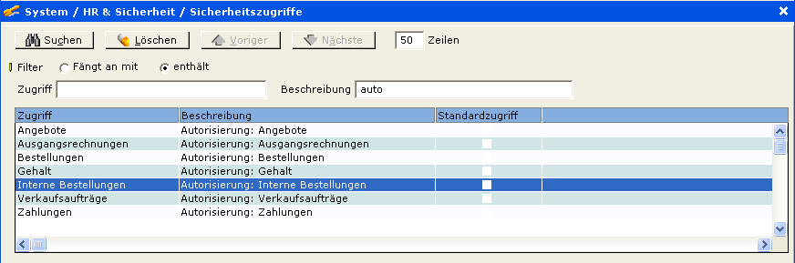 Wenn Sie den Radiobutton Filter: Fängt an mit bzw. Filter: enthält markieren und die folgenden Felder des Kopfbereichs mit vollständigen oder auch Teilen von Auswahlkriterien füllen, werden nur die Sicherheitszugriffe aufgelistet, die mit Ihren Eingaben beginnen bzw. Ihre Eingaben an beliebiger Stelle enthalten: