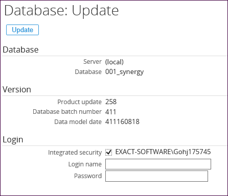 You can update the database only if you have sufficient rights to access the database in SQL server. If you are an administrator for Exact Synergy Enterprise but do not have SQL administrator rights, you will not be able to update the database. However, you can use the login of a user who has rights to access the database in SQL server. Both users will require the SQL security role System Administrators to successfully update the database.