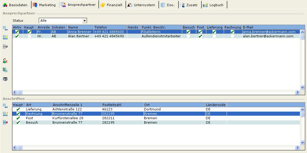 Anschriftenarten zur Kontaktaufnahme sind z. B. eine Lieferung, ein Besuch, Rechnungen etc. Welche Anschriftenarten in diesem Bereich aufgelistet werden, hängt davon ab, welche Person im oberen Fensterbereich Ansprechpartner markiert wird.