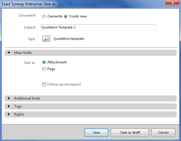 • Under the Main fields section, you can save the quotation template as a Page or Attachment