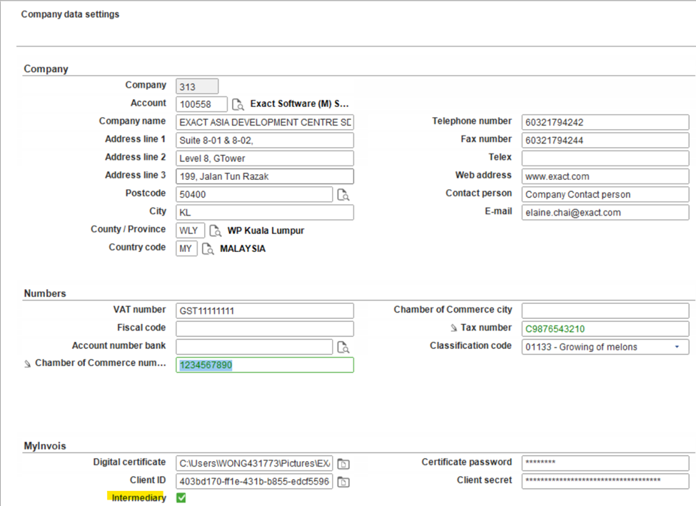 We have added the Intermediary checkbox under the MyInvois section in the Company data settings screen (). If this checkbox is selected, the company can log in as the intermediary to submit the e-Invoice to LHDN for the taxpayer.