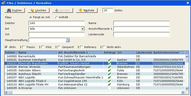 Wenn Sie den Radiobutton Filter: Fängt an mit bzw. Filter: enthält markieren und die folgenden Felder des Kopfbereichs mit vollständigen oder auch Teilen von Auswahlkriterien füllen, werden nur die Debitoren aufgelistet, die mit Ihren Eingaben beginnen bzw. Ihre Eingaben an beliebiger Stelle enthalten: