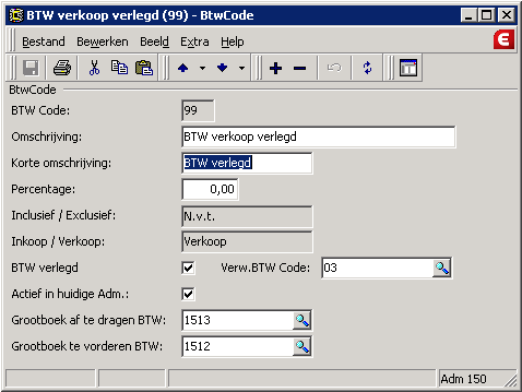 Standaard BTW verlegd selecteer men de BTW code verkoop verlegd