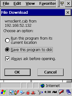 When you have chosen 'Save this program to disk' and after downloading has completed, start File Explorer on the device and browse to the root folder ('My device'). Double tap on the file 'wmsclient.cab'. The WMS client is installed in folder \Program Files\WMSclient, and a new menu entry 'WMS client' is created in Start, Programs.