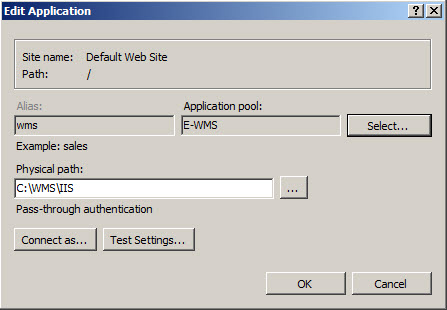 When a specific Application Pool was configured for E-WMS, it still has to be linked to the E-WMS web site. Start IIS manager, expand the server name, expand "Sites", expand "Default web site". Click on the E-WMS web site and choose Basic settings in the far right panel. Click on Select and choose your specific Application Pool: Press OK to save this configuration.