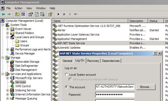 First, the system account used for ASP.NET needs rights. You can check what system account is used for ASP.NET, by checking the 'logon account' for the Windows service 'ASP.NET State Service', on the IIS server: