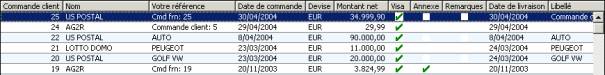 Dans la liste sont affichées les commandes clients répondant aux critères de sélection définis. Dans la colonne 'Visé' est affiché un ü vert si la commande en question a été visée. Les commandes non visées ne sont d'ailleurs pas affichées parce que pour pouvoir imprimer une confirmation, il faut d'abord viser la commande. Un ü vert vient s'afficher dans la colonne 'Imprimé' dès que la commande en question est définitivement confirmée. Un ü vert est affiché dans la colonne 'Annexe' si une annexe est jointe à la commande. Vous pouvez éventuellement modifier les colonnes de manière à voir directement les informations dont vous avez besoin.