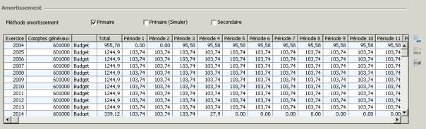 Dans cette section, vous voyez les amortissements budgétisés et les amortissements réel par exercice et par période.