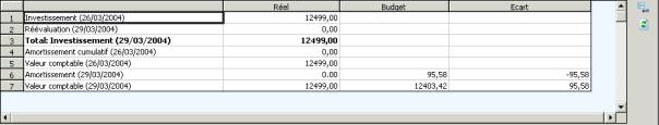 Dans cet onglet, vous voyez les mouvements relatifs ŕ l'immobilisation. Dans le haut de l'écran, vous voyez des totaux, comme le montant total de l'investissement, le montant total amorti et la valeur comptable de l'immobilisation.