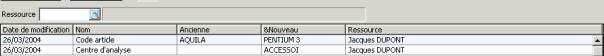 Cet onglet contient un journal de bord dans lequel sont enregistrées les modifications apportées aux données de base de l'immobilisation. Vous pouvez demander toutes les modifications en ne complétant pas la ressource ou, au contraire, demander les modifications par ressource en complétant le champ 'Ressource'.