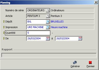 Pour lancer le planning, vous pouvez cliquer sur le bouton 'Générer'. L'écran suivant apparaîtra alors. Vous avez ŕ ce moment la possibilité d'entrer une "heure machine" et le nombre d'heures planifiées. A hauteur des champs 'De' et 'A', vous pouvez indiquer la suite de dates auxquelles l'immobilisation sera utilisée. Vous pouvez ensuite cliquer sur le bouton 'Générer', aprčs quoi les heures planifiées seront affichées dans l'écran ci-dessus.