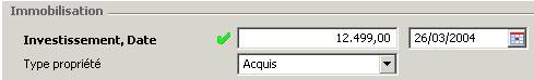 • Si vous n'avez pas encore généré d'écriture d'achat, vous pouvez encoder le montant de l'investissement ici. Au moment oů vous sauvegardez l'immobilisation, un écran s'ouvre dans lequel vous pouvez générer directement l'écriture d'achat. Le montant entré ŕ hauteur du champ 'Investissement' est utilisé pour cette écriture.
