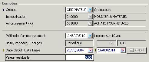 Les comptes affichés ici sont récupérés des données de base du groupe d'immobilisations. Vous n'avez pas la possibilité de les modifier.