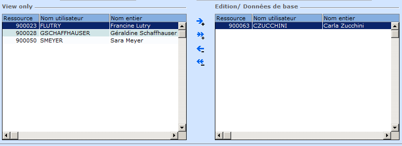 Si vous désirez déplacer des utilisateurs d’une section à l’autre, vous pouvez utiliser les flèches bleues. Les doubles-flèches déplacent tous les utilisateurs à la fois. Les utilisateurs avec un droit d’administrateur ne pourront pas être déplacés.