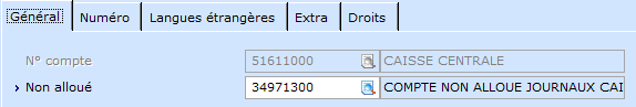 Sélectionnez ici le compte de contrepartie fixe du journal. Pour les journaux de banque, il s'agit d'un compte 550000 ; pour les journaux de caisse, d'un compte 570000 ; pour les journaux de vente, d'un compte 400000 ; pour les journaux d'achat, d'un compte 440000 et enfin pour les journaux d'O.D., d'un compte d'attente. Tous les mouvements enregistrés dans ce journal seront imputés sur ce compte. Les comptes collectifs clients et fournisseurs sont liés aux journaux de vente et d'achat. Nous vous conseillons d'utiliser un compte de contrepartie séparé pour chaque journal. Si vous avez créé un compte séparé pour chaque compte bancaire par exemple, il vaut mieux créer un journal de banque séparé pour chacun de ces comptes.