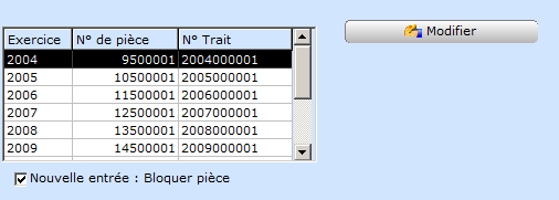 Vous pouvez commencer chaque exercice par un numéro de pièce unique. Si vous commencez à passer des écritures en 2004 suite à la clôture annuelle, vous pouvez indiquer pour chaque journal quel est le premier numéro de pièce. Il vous suffit pour cela de sélectionner la ligne correspondant à l'exercice adéquat et de cliquer ensuite sur 'Modifier'. Le curseur se positionne alors automatiquement dans la colonne 'N° pièce'. Vous pouvez maintenant entrer le premier numéro pour cet exercice. Vous devez le faire pour chaque journal séparément.