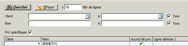 La présentation de cet écran est la même que celle de l'écran de mise à jour des clients. Sélectionnez ici le client pour lequel vous voulez définir des accords de prix. Cliquez ensuite sur le bouton 'Ouvrir'. Vous ouvrez ainsi l'écran de création et de mise à jour des prix spécifiques dans lequel vous pouvez modifier les données de votre choix.