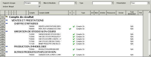 Vous pouvez masquer ou afficher les comptes d'un type ('Bilan'/'Résultats'),