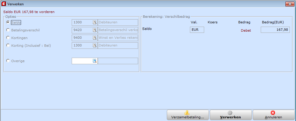 Wanneer u deze optie selecteert wordt het verschilbedrag geboekt als