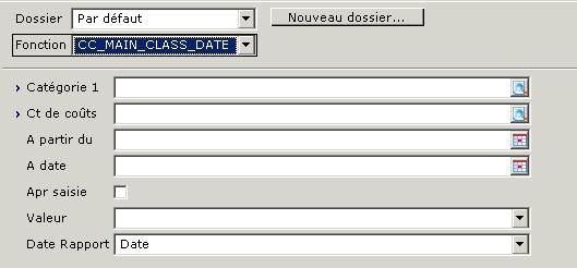 Sélectionnez ici la fonction que vous souhaitez utiliser. Pour sélectionner le solde d'un centre de coûts pour une ou plusieurs rubriques et un intervalle de dates, vous devez opter pour "CC_MAIN_CLASS_DATE".