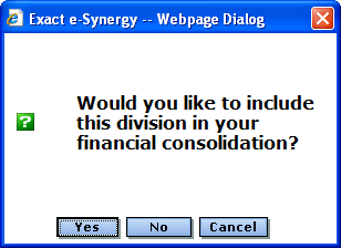 Click Yes to include the division in the financial consolidation, No to exclude the division from the financial consolidation, or Cancel to close the message box. The details of the setting to include the division in the financial consolidation will be displayed in the Consolidation section of the overview of share movements of the shareholder. For more information, see Overview of Shares Movement.