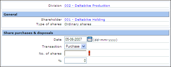 Note: If you are linking a shareholder to a division, you will see the above screen. However, if you are linking a division to a shareholder, the order of fields in the top section and the General section will be different. In the second scenario, you will see the Shareholder field in the top section, followed by the Division and Type of shares fields in the General section. Meanwhile, fields in the Share purchases & disposals section will be the same.