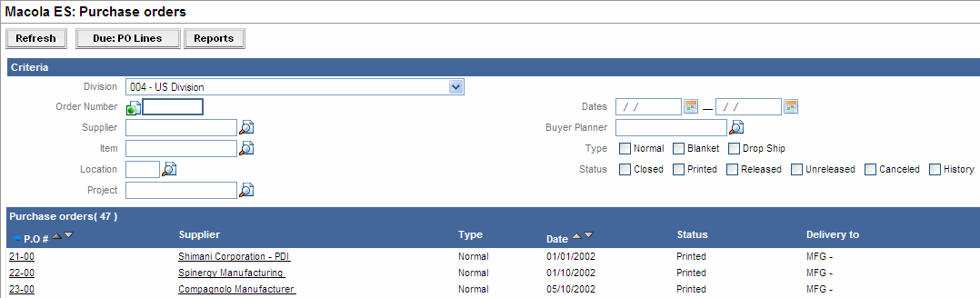 - Click Due: PO Lines to view a related report of Purchase Order Items that are due.