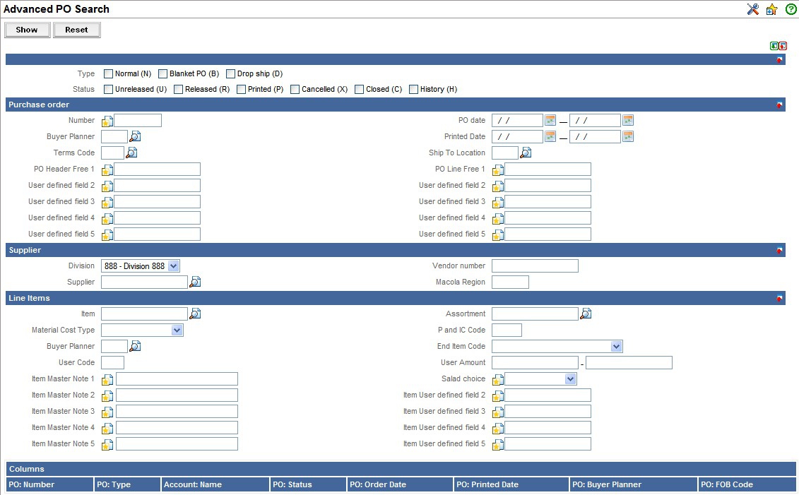 The criteria for the search are flexible and support many of the fields in the Purchase Order Header and Purchase Order Line tables.