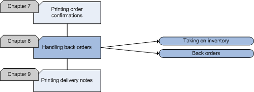 This chapter describes how to handle back orders and how to take on inventory. The flowchart explains the steps in the process and the accompanying functionality in Exact Financials.