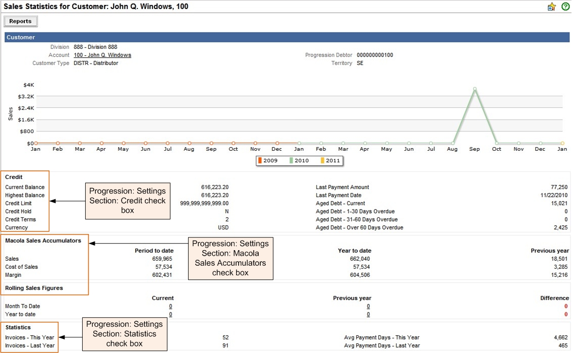 - In the section "Pages: Sales Statistics", select or clear check boxes to show or hide additional information on the Sales Statistics report, which is on the account card: